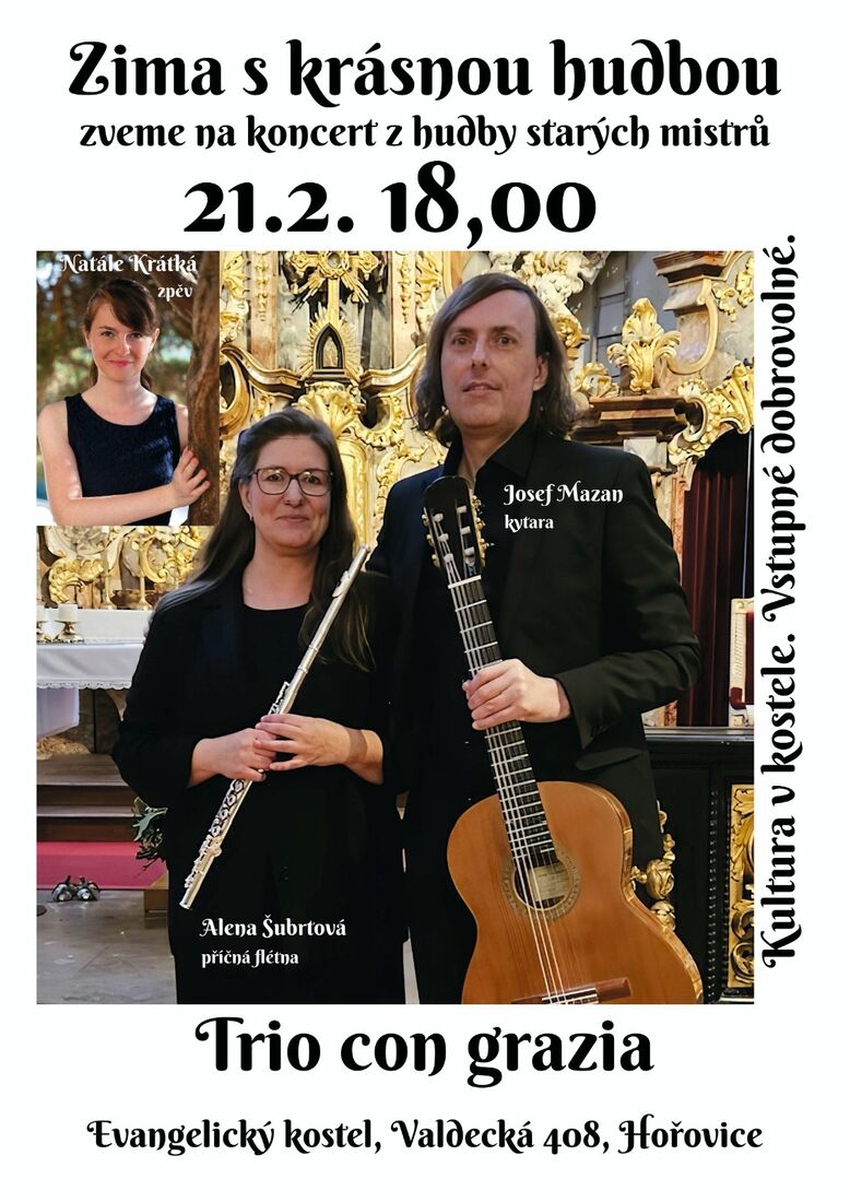 V rámci cyklu Kultura v kostele zveme na koncert Trio con grazia v sobotu 21. února 2026 od 18.00 hodin v evangelickém kostele v Hořovicích.
